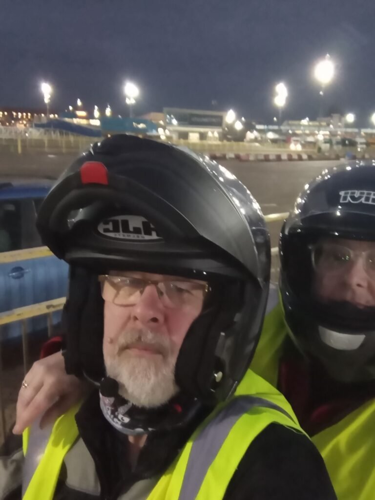 We only stopped once on the way down to Portsmouth, and that was just for a toilet break; by then we simply wanted to get to the ferry port. Whilst riding along the M3 towards the M27, our fuel warning light came on, and to our dismay the “next services” sign informed us there were no services going east—the direction we needed.